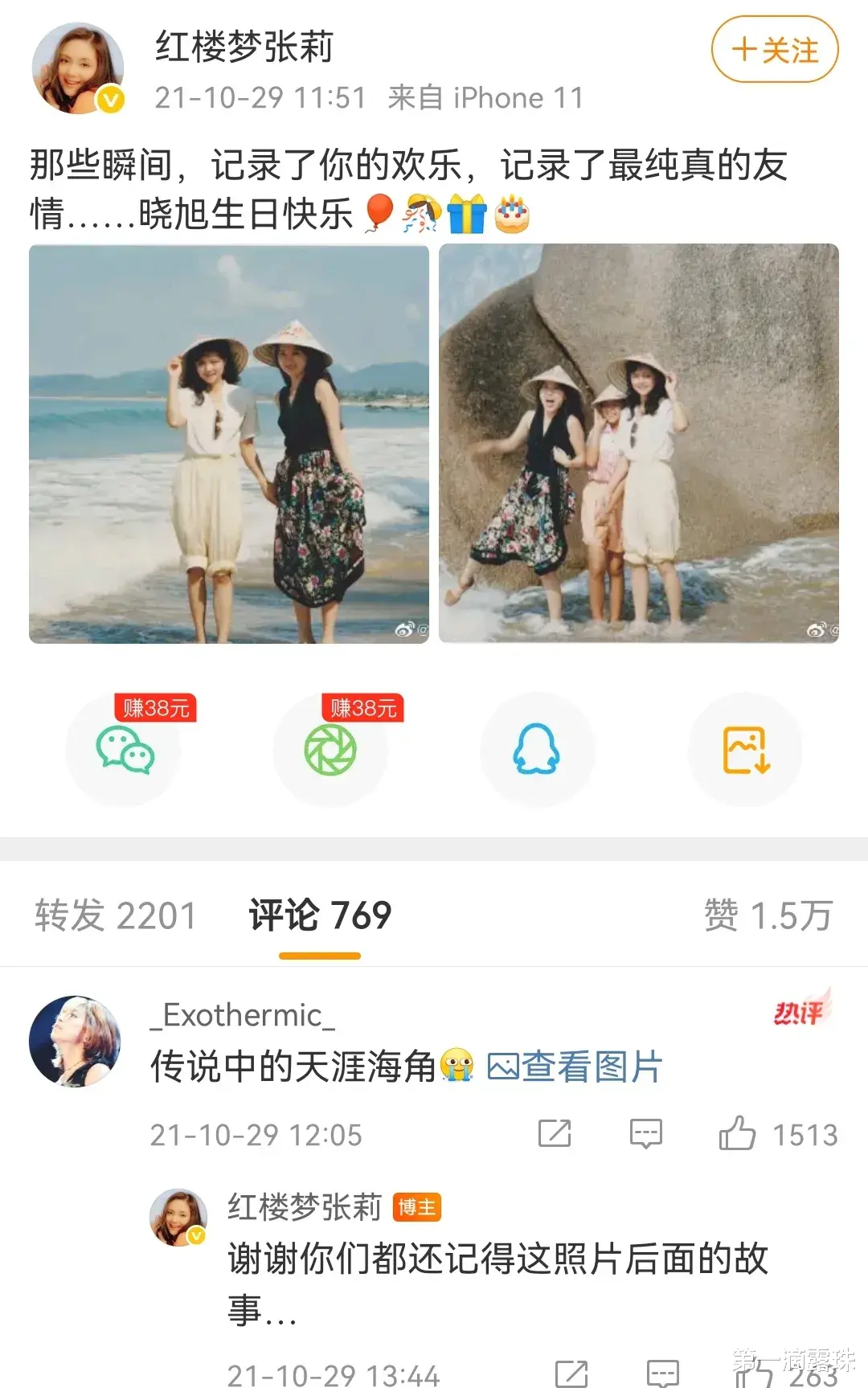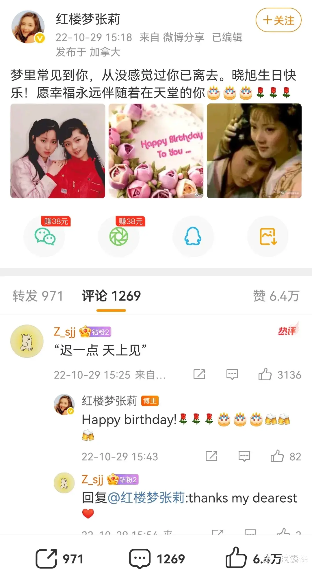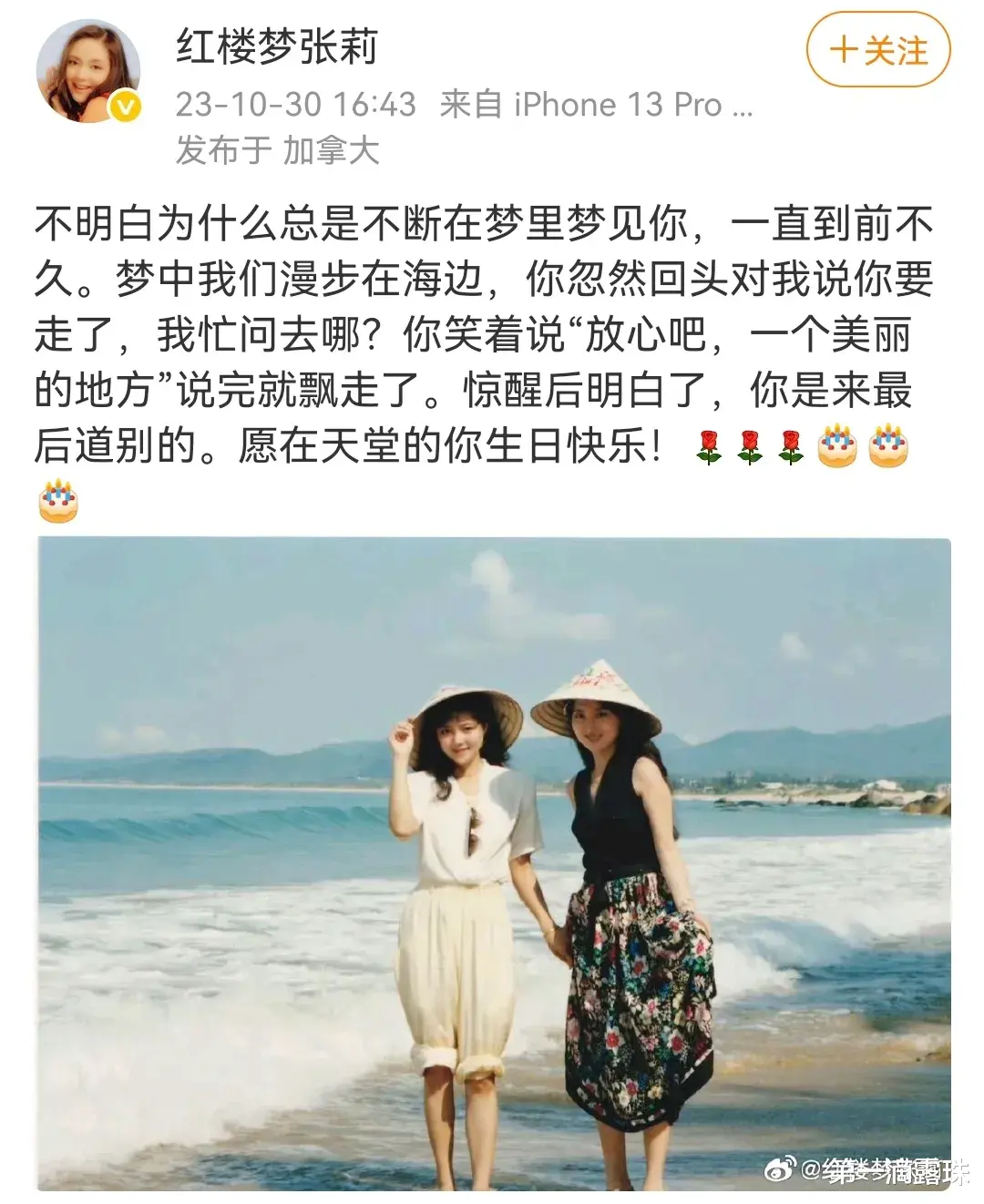 此后十余年,无论身处何地,张莉总会在陈晓旭的生日10月29日和忌日5月13日准时发文悼念好友。