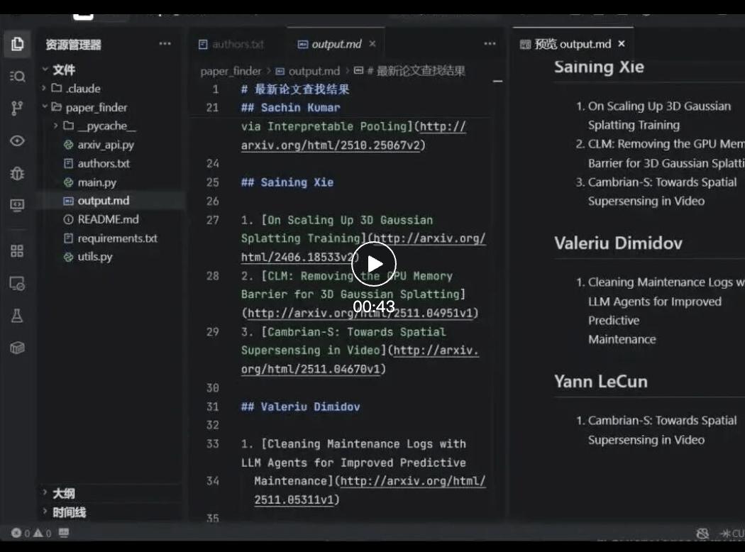 7 分钟,Doubao-Seed-Code 就搞定了一切。它还生成了一个 authors.txt 文件,里面包含 Geoffrey Hinton 等四位 AI 领域的传奇人物,现在我们为这份名单添加更多人物(包括近期有更新的作者),测试一下。