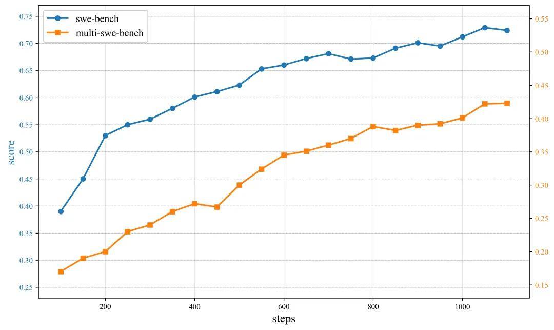 如下图的数据所示,在 multi-swe-bench 和 swe-bench-verified 两个基准上,Doubao-Seed-Code 的性能在训练过程中呈现一致的上升趋势,这表明模型具有良好的泛化能力。