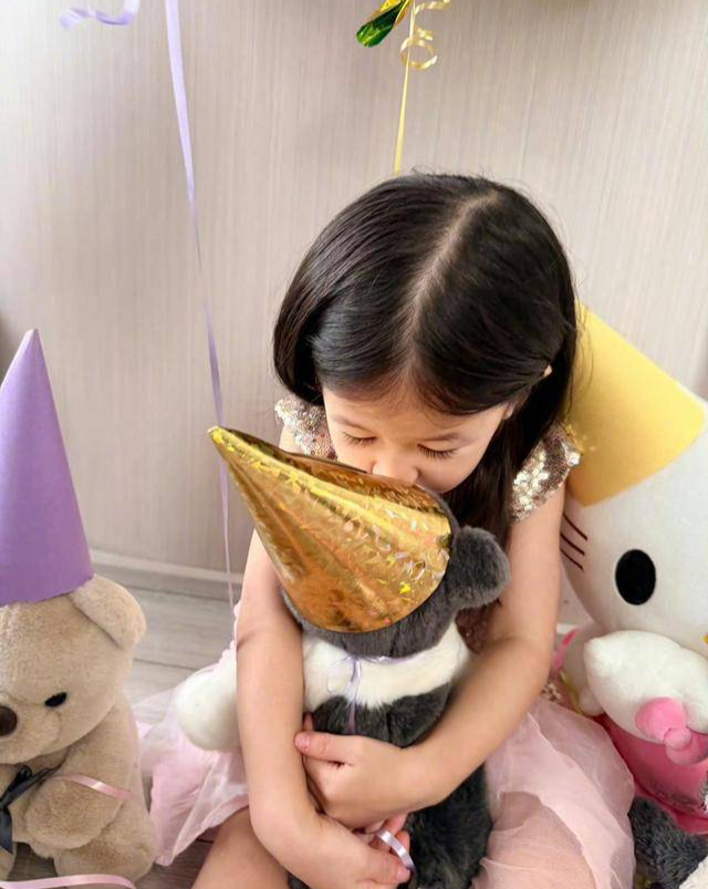 钟嘉欣的女儿作为小寿星,她当天也是很开心,留着一头长发的她将头发披散下来,看起来很乖巧,她笑起来的时候眼睛几乎眯成了一条缝,五官也是很立体,和爸爸极为相像。