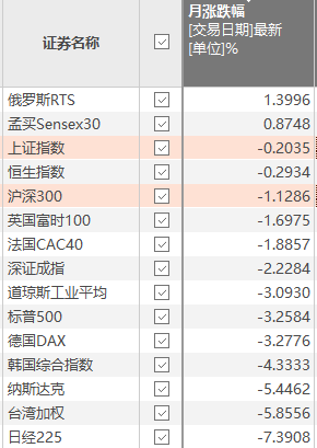 上证指数仅下跌0.2%,恒生指数下跌0.3%,沪深300下跌1.1%。而其他股市都是2%~7%的跌幅。