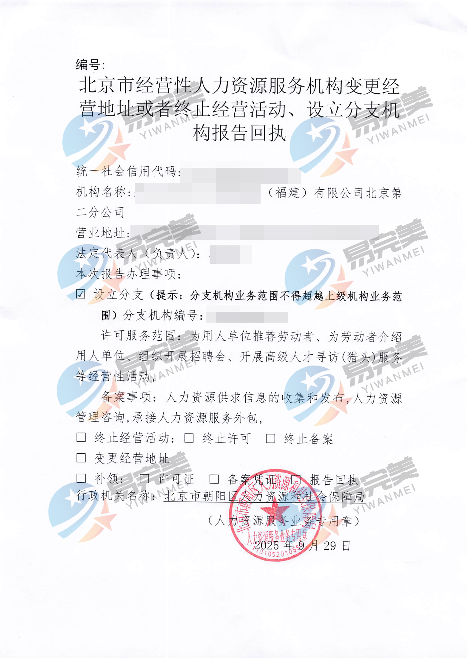 北京新下2025年10月13日人力资源服务许可证分公司备案