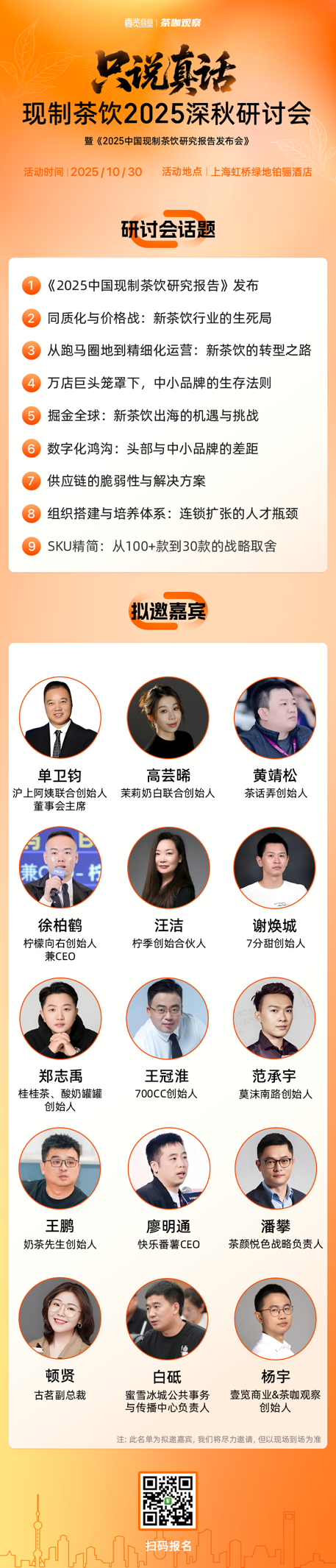 目前正在邀请的嘉宾有沪上阿姨联合创始人单卫钧、茉莉奶白联合创始人高芸晞、柠檬向右创始人徐柏鹤、柠季创始合伙人汪洁、古茗副总裁顿贤、茶百道副总裁王峰、甜啦啦海外事业部负责人谢观海……为了保证分享足够“干货”,我们将给足每位嘉宾时间,让他们畅所欲言。