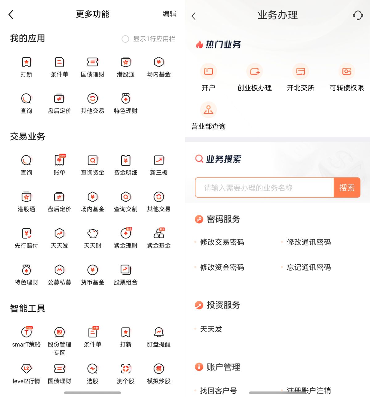 业务办理功能的补全也很实用,现在点击左上角三条线,就能快速办理营业部查询、信息修改、账户激活等业务,也可以通过搜索功能直接找到,动动手指,轻松办完!