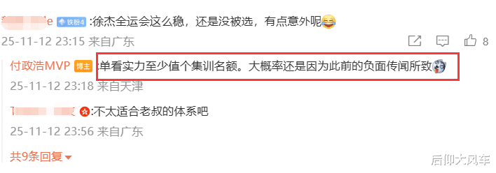 不妨来看看CBA知名媒体人付政浩对于徐杰落选的看法,有球迷在付老师关于国家队新一期集训名单的解读动态下留言,问徐杰全运会表现这么稳,还是没被选的原因,付老师评论回复了一句:单看实力(徐杰)至少值个集训名额,大概率还是因为此前的负面传闻所致。