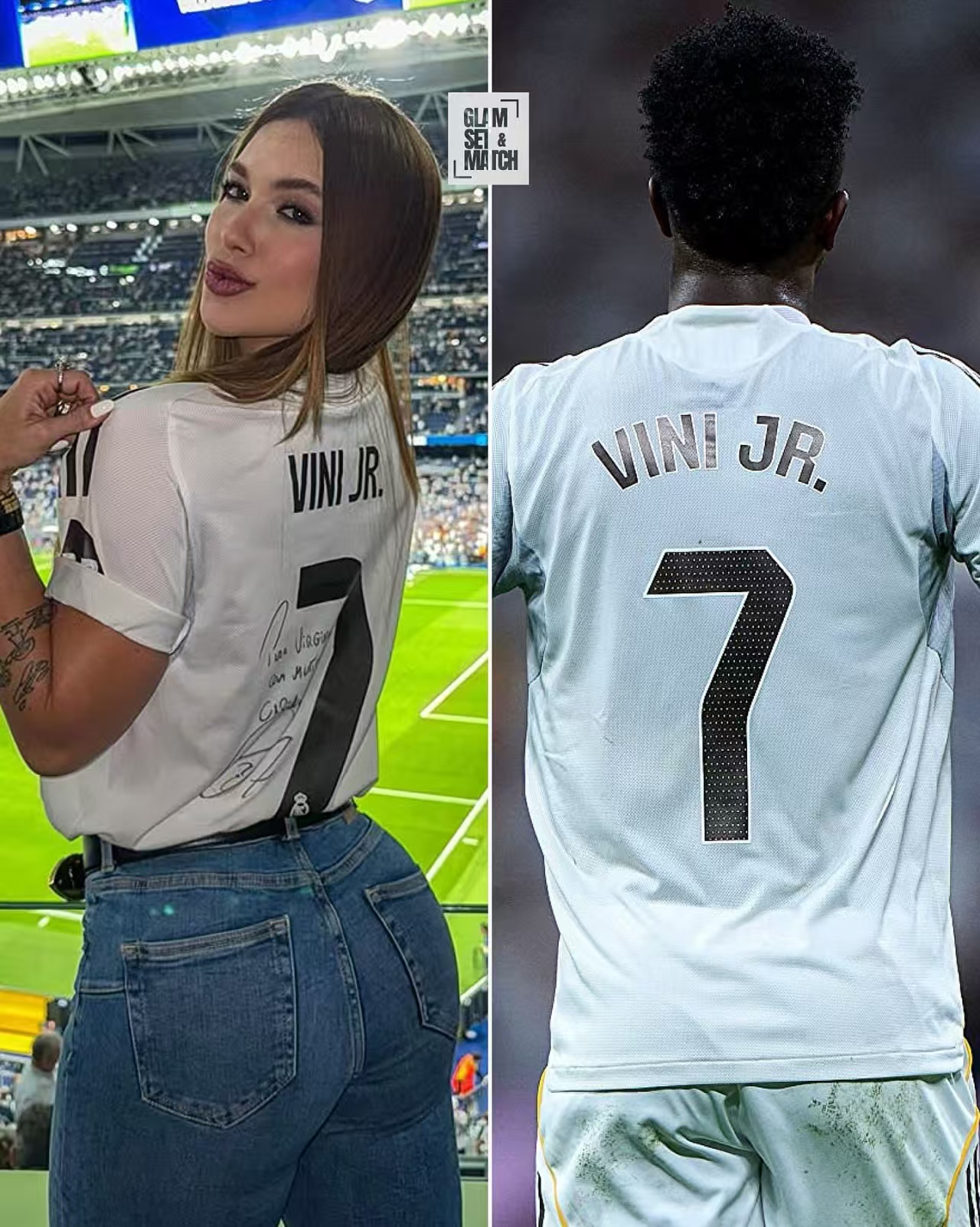 上周末的伯纳乌来了一位神秘的女观众,那就是皇马7号维尼修斯的绯闻女友弗吉尼亚,并在球场晒出了维尼修斯的皇马7号球衣以及球员亲笔签名。