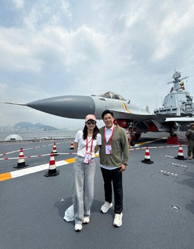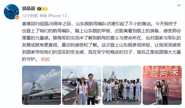 他们在6日晚上双双发文,郭晶晶坦言山东舰访港引起不小轰动,今天终于登上了咱们的航母编队,感受到国家带来的安全感,同时分享和霍启刚登陆航母的照片,身后的歼15十分抢眼。