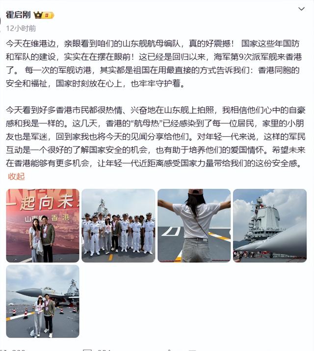 与此同时,霍启刚也发文表示很震撼,看到香港市民很热情很兴奋,相信大家一样都有自豪感,文中附上多张照片,其中是一张郭晶晶绝美的背影照,郭晶晶站在航母上大鹏展翅,令人无限遐想。