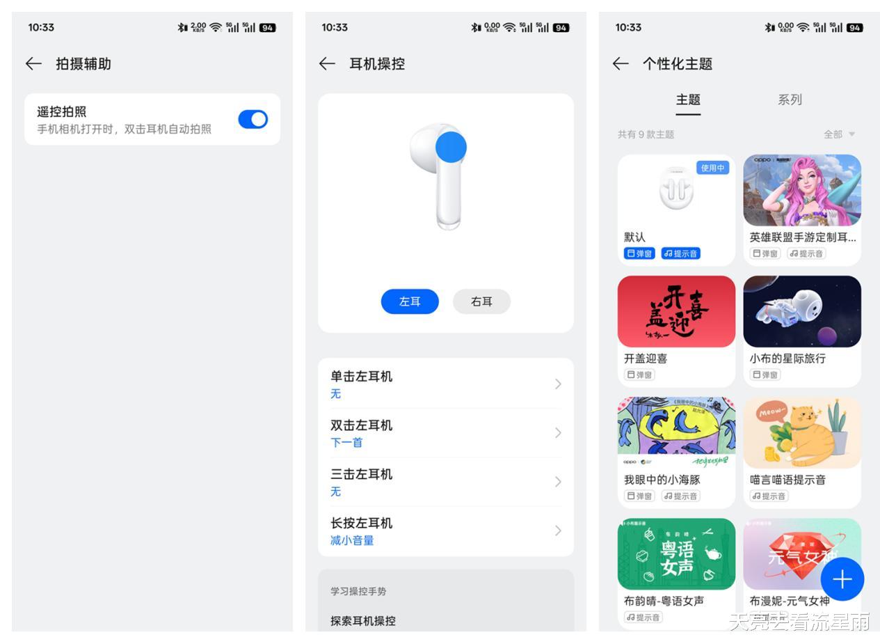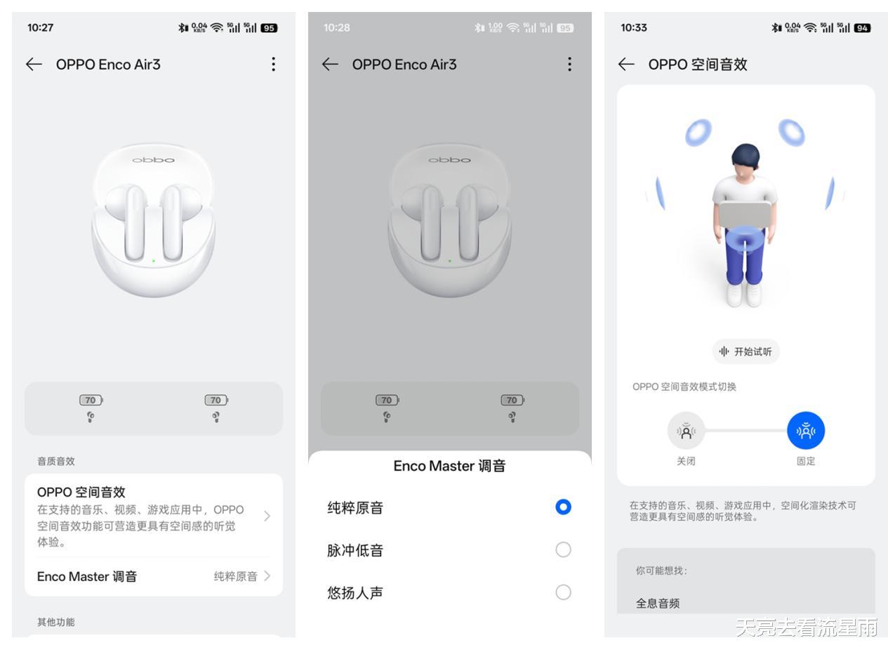 我用的OPPO Find X8 Ultra手机内置有oppo无线耳机配套软件,其它品牌手机可下载名为“欢律”的软件配套使用。通过软件可以进行查看耳机电量、调音、开启空间音效、设置遥控拍照、更改耳机操控、个性化主题设置等操作。
