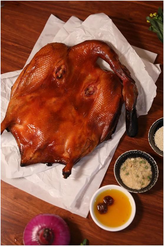 刚出炉的鸭皮金黄酥脆似琵琶琴身,咬开却是嫩滑多汁的“好嘢”,蘸点梅果酱,酸甜解腻,连骨头都带着荔香。