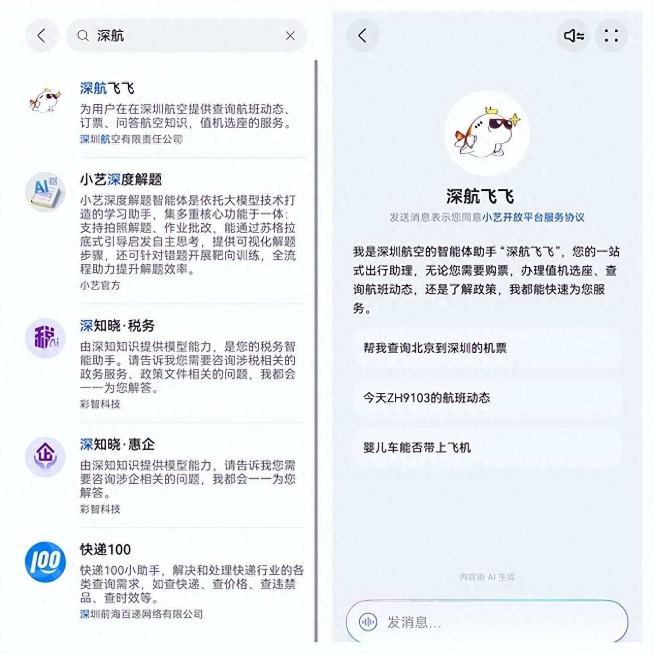 我打开刚升级完鸿蒙5的华为Pura 80——在小艺App-发现-智能体市场里的深航飞飞Agent,帮我快速预定机票。