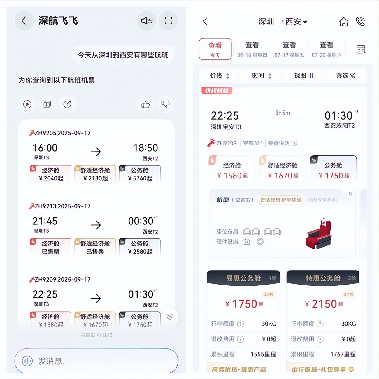 打开深航飞飞Agent后,我直接对着深航飞飞Agent说出需求:“今天从深圳到西安有哪些航班?”深航飞飞Agent几乎没有迟疑就给出回复,深圳到西安的航班信息很快清晰列出,时间、价格、舱位一目了然,甚至还贴心标出了已售罄的航班。