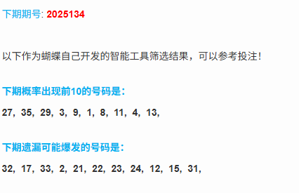 本期分析:本期的冷热分布,本期的遗漏大于9的号码有10个,上期的冷码开出了1个号码,温码开出了3个号码,上期热码也开出了1个号码,上期的热码没有开出3个号码,那么热码本期是最后一次机会了,如果不连续开出3个,那么这一波短暂的热码潮流就结束了,本期防一下热码,冷码和温码里面,个人觉得温码本期要考虑2个左右,冷码考虑1到2个号码即可。(热码:蝴蝶算法中概率前10的号码,只有10个;冷码:遗漏大于等于9的号码;温码:排除前2类之外的剩下的号码,都是温码;)