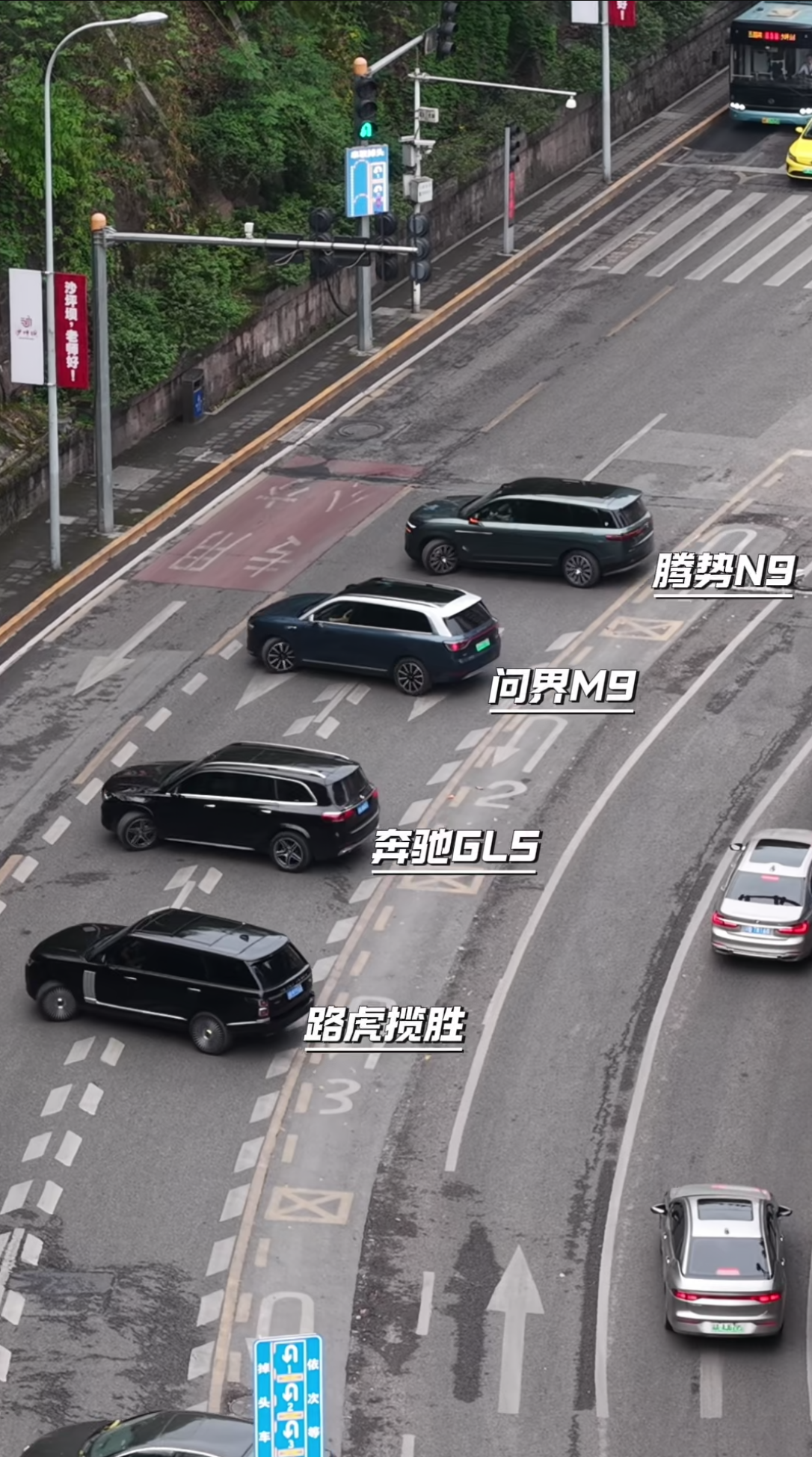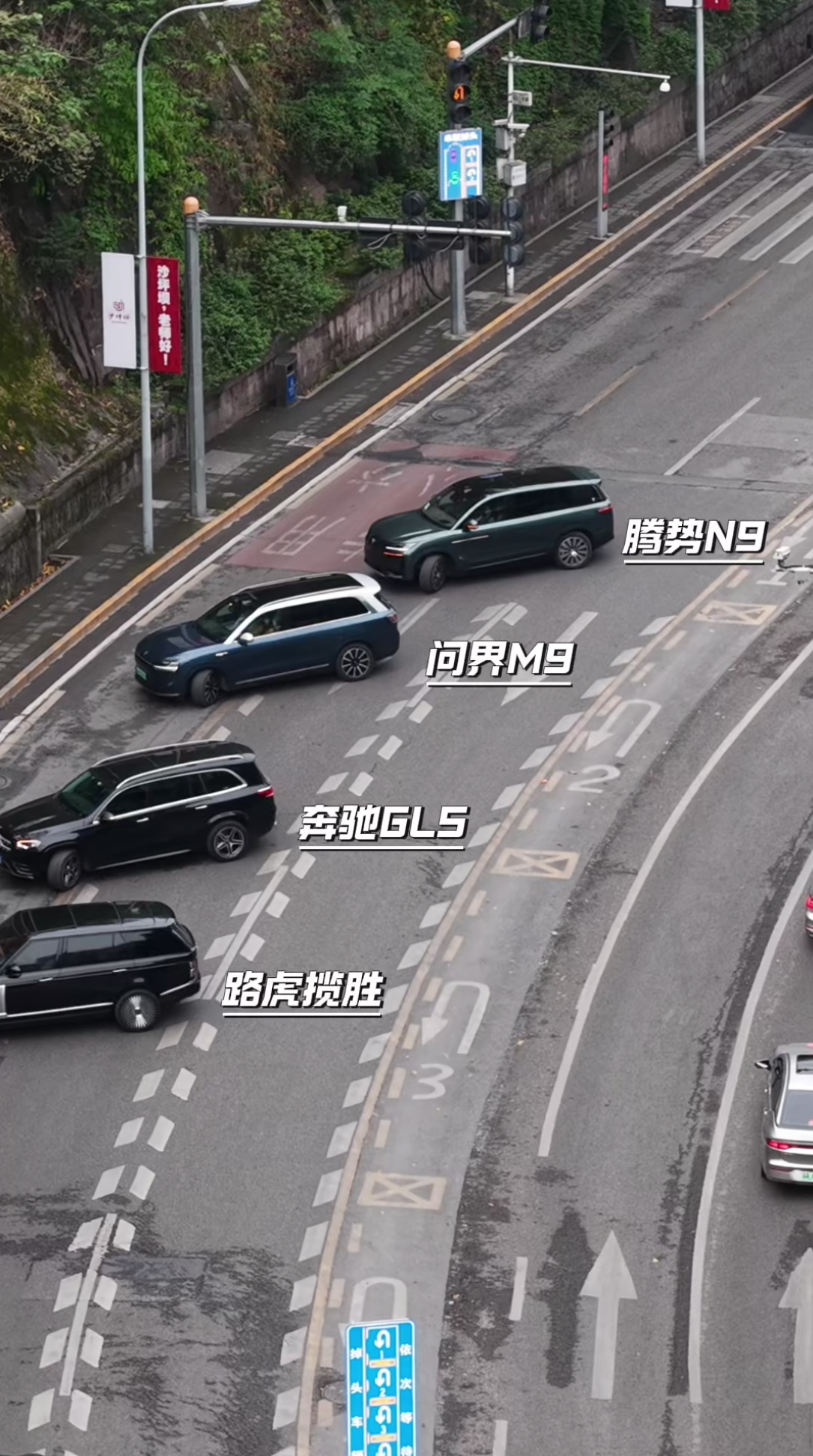 最近在重庆一个网红掉头路段就上演了真实对比:四台旗舰级大型SUV同场掉头,其中三台都因为转弯半径大,掉完头只能拐到最外侧车道,动作略显笨拙。而腾势N9却凭借「易三方技术」和后轮大角度转向,轻松一把掉头,直接进入第二车道,姿态从容又高效。