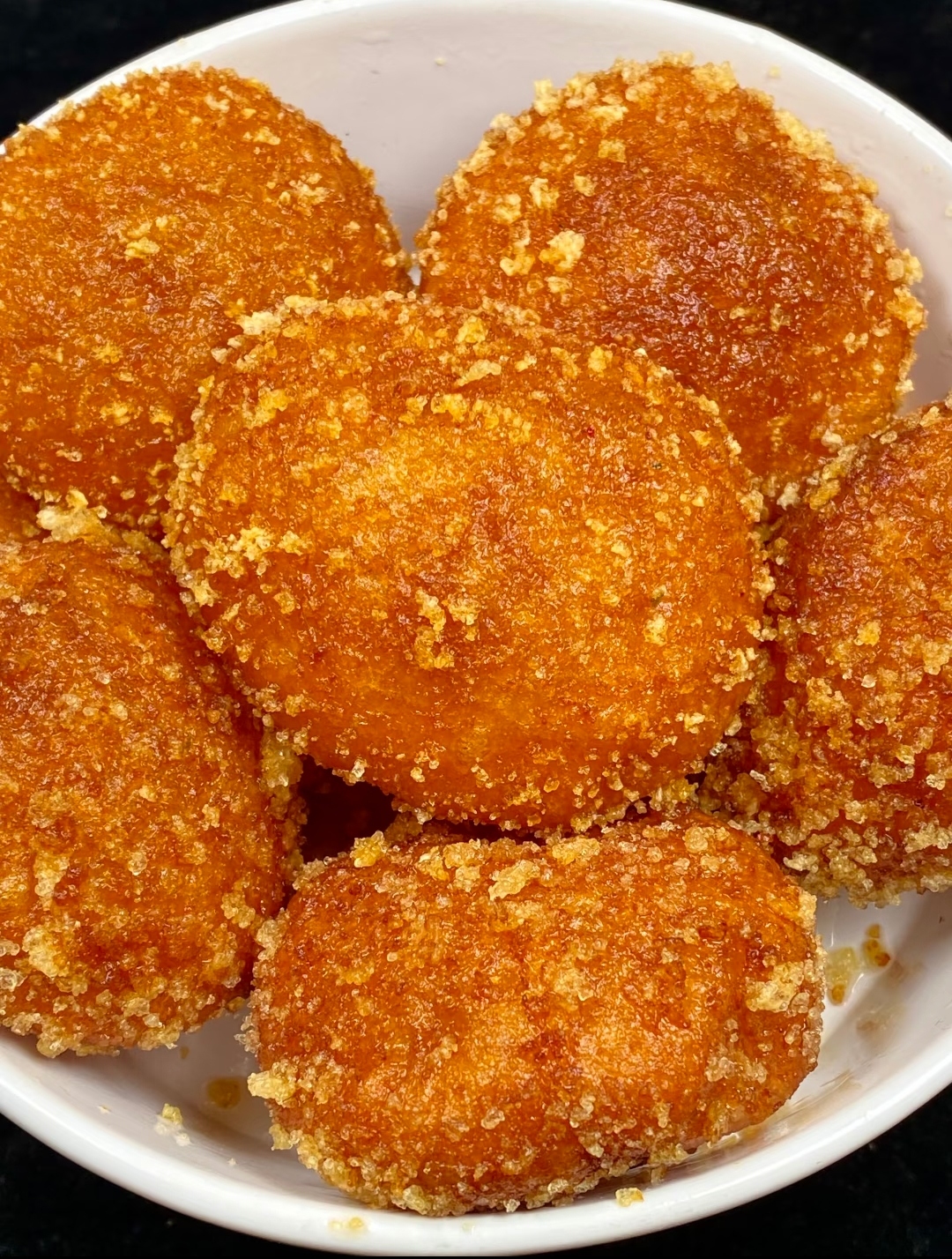 把面团搓成乒乓球大小,按扁成 1 cm 小圆饼。手指蘸清水,给饼洗个“冷水脸”,表面湿润即可,扔进面包糠里滚三圈,360° 裹满。面包糠选“金黄颗粒”,炸完颜色更炸场;想要低油,用“日式白色面包糠”,空气炸锅 180℃ 10 分钟,一样咔嚓脆。