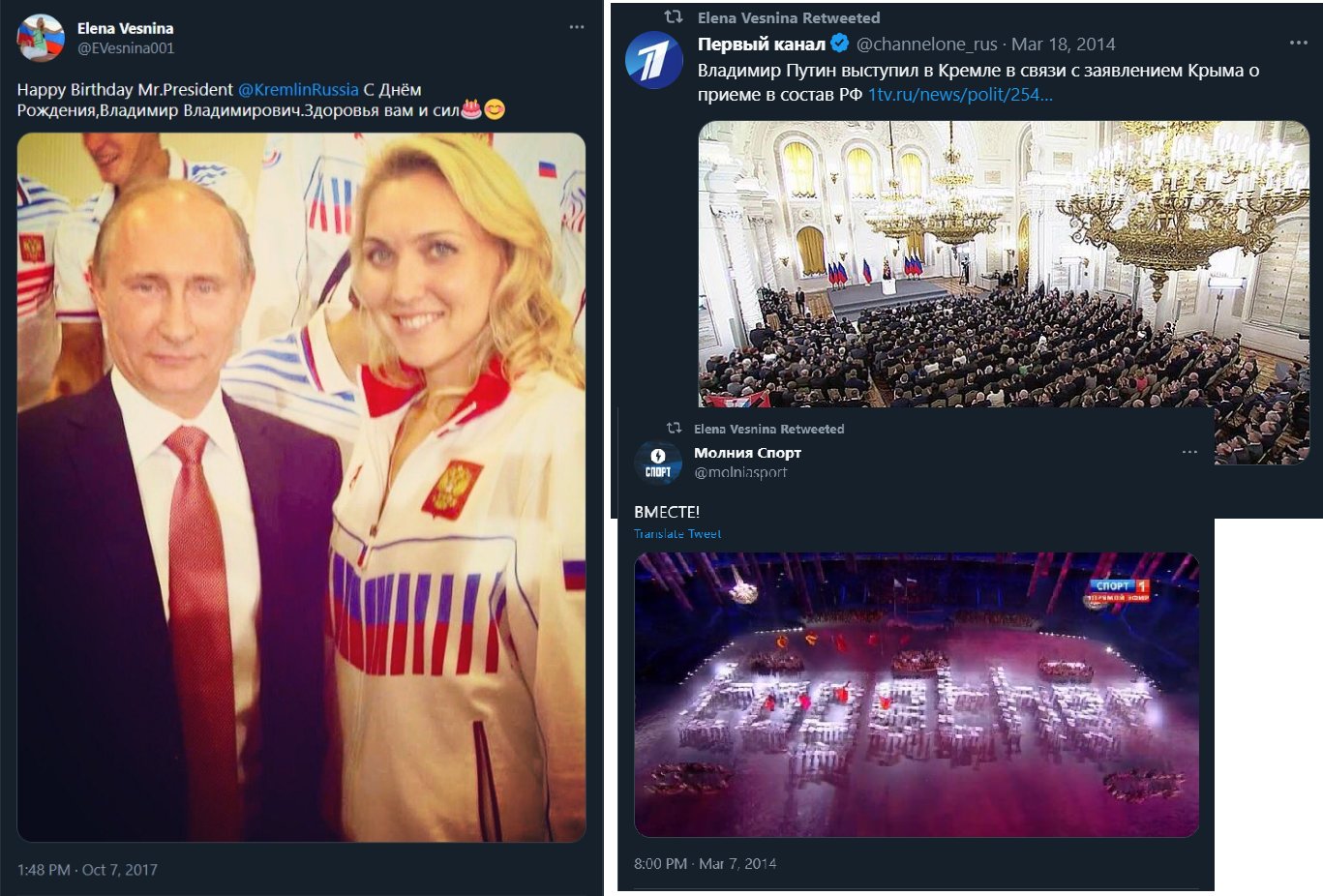 在上述名单发布之前,乌克兰媒体普遍猜测维斯尼娜不可能通过“中立测试”,因为她曾是有俄罗斯军方背景的“中央陆军军事俱乐部”成员,在该俱乐部的网站上,仍能找到对她的感谢和支持的帖文。在俄乌战争之前,维斯尼娜曾在社交媒体上发布她与普京的合影,还曾在2017年普京生日期间发布祝他一切顺利的帖子。