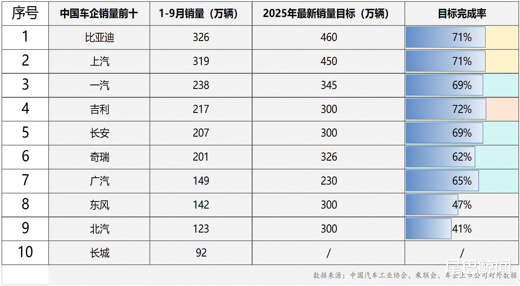 一汽集团与长安汽车紧随其后,分别以 238 万辆、207 万辆的累计销量完成全年目标的 69%