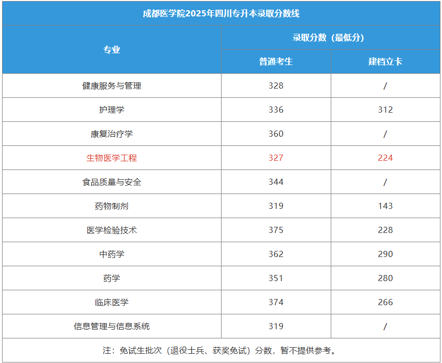 成都医学院2025 年专升本普通批最低录取分普遍在 320 分以上: