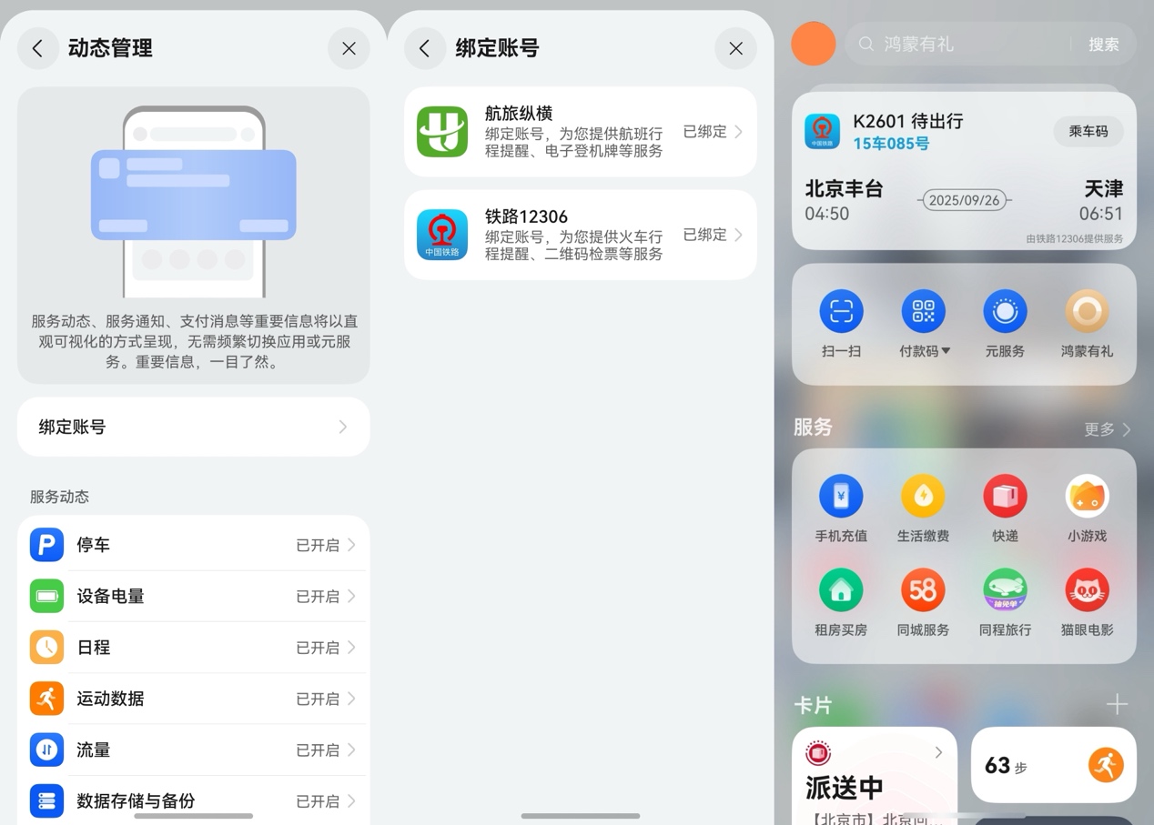 不过用鸿蒙5的小伙伴,就没这些烦恼啦!手机桌面右滑至负一屏,好多出行准备都能在这儿集中搞定。比如在服务动态里把12306账号关联上,负一屏顶部的12306服务动态就会自动显示车次、座位,出发到达时间等,还会实时推送列车状态变化,这比每次点开App来查,方便太多了!