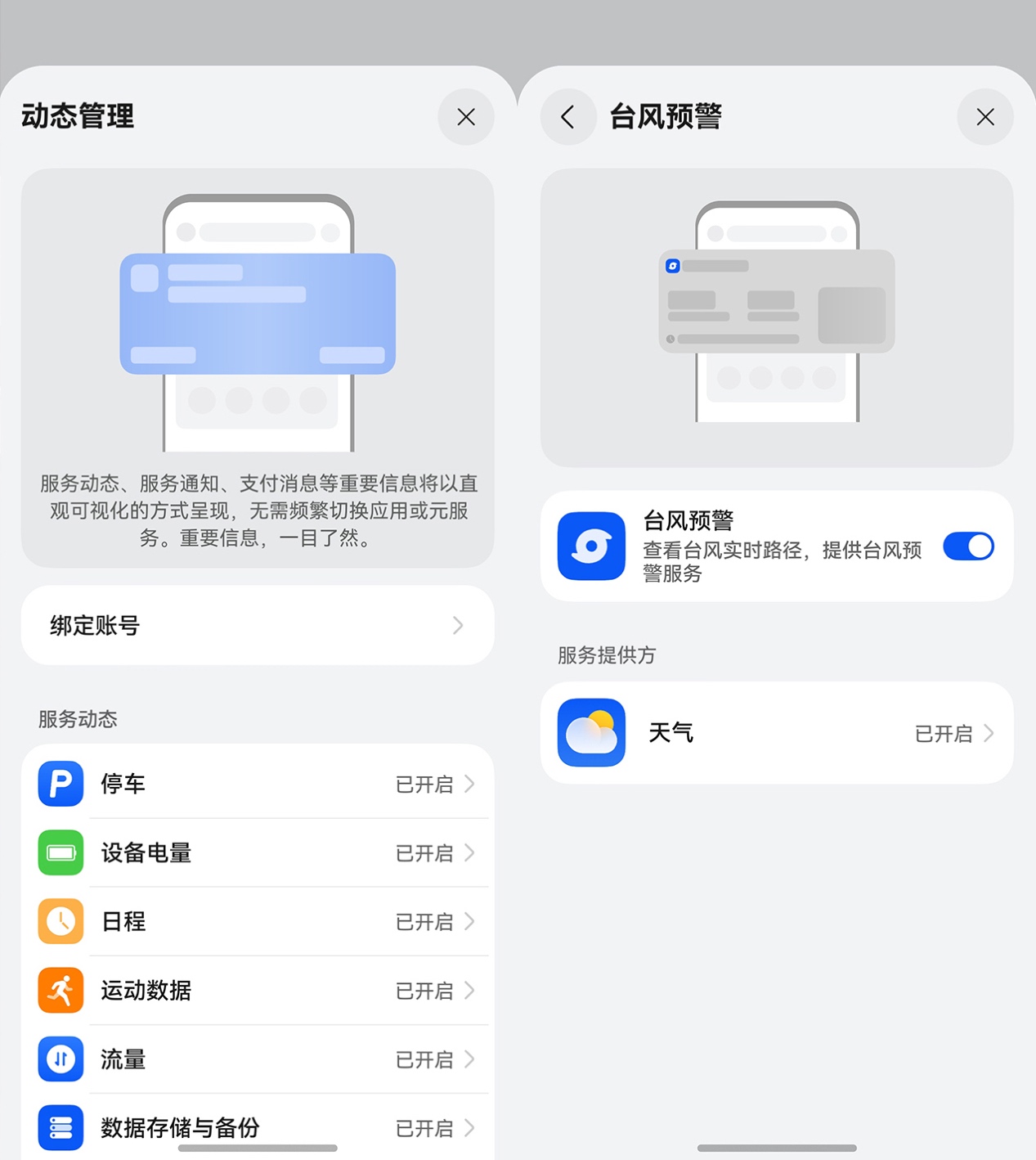 最近超强台风“桦加沙”即将登陆广东,住在沿海的小伙伴一定要及时到负一屏设置的“动态管理”中开启“台风预警”!
