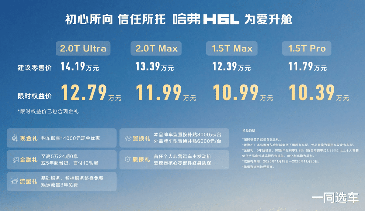 11月18日,哈弗H6L正式上市,售价:11.79万元-14.19万元,限时权益价:10.39万元-12.79万元。
