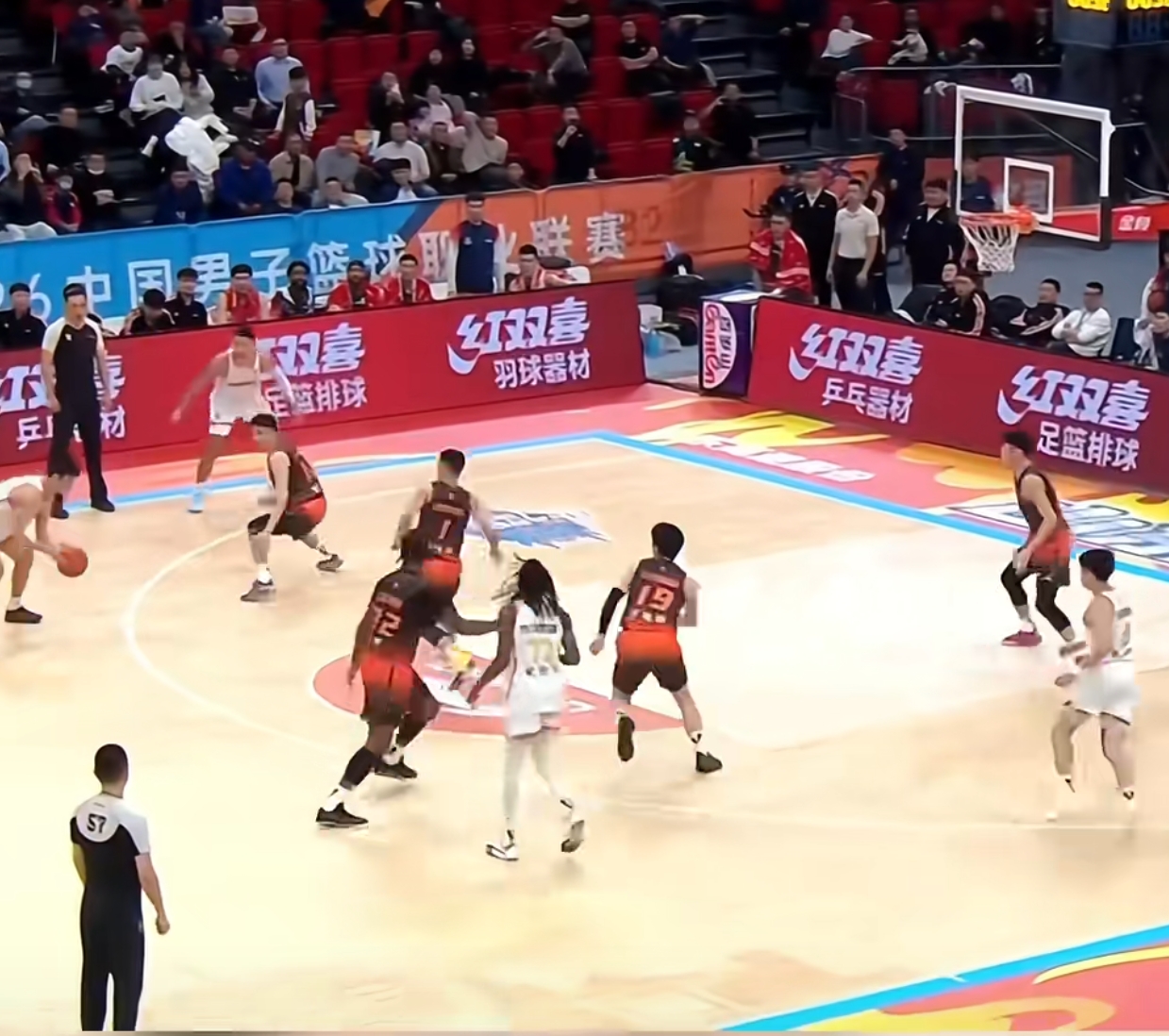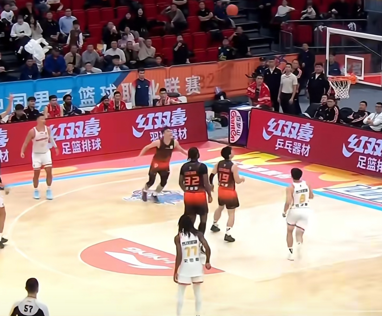 裁判刚一开场还没吹哨,深圳队那边马上就来了个快攻反攻,王浩然在弧顶三分线外两步的位置接到球,眼前差不多没啥防守的人,一抬手就把球投了出去。