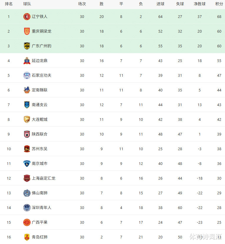 至此,2025赛季中甲联赛总排名如下:1、辽宁铁人68分【夺冠升超】;2、重庆铜梁龙60分【升超】;3、广东广州豹60分;4、延边龙鼎55分;5、石家庄功夫;6、定南赣联;7、南通支云;8、大连鲲城;9、陕西联合;10、苏州东吴;11、南京城市;12、上海嘉定汇龙;13、佛山南狮29分;14、深圳青年人28分;15、广西平果25分【降级】;16、青岛红狮13分【降级】。