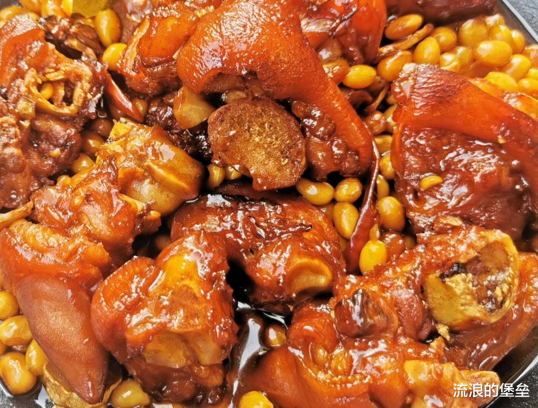 剩下的就是四蹄,猪蹄汤、烀猪蹄、卤猪蹄,猪蹄炒黄豆,东北人没有能拒绝这道菜的,每年过年必吃的一大食材,年年不落!