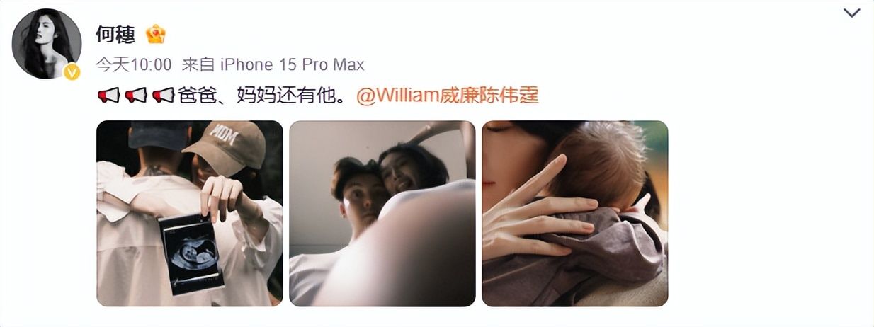 两人的官宣文案还很有爱,“爸爸妈妈,还有他”。照片是两人得知怀孕后的B超照,以及何穗孕期的孕肚照,还有两人分别抱着儿子的照片。
