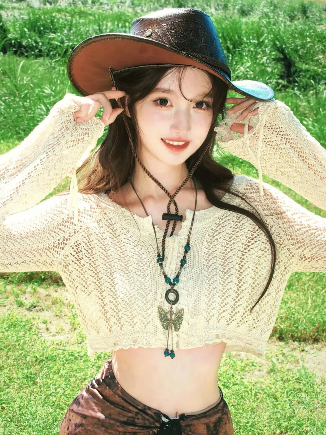想让画面瞬间有“故事感”?试试手轻扶帽檐的姿势。将手指自然搭在牛仔帽的帽檐边缘,无需用力抓握,保持松弛感更显随性~身体微微向一侧倾斜,头部跟着轻轻歪一点,眼神温柔看向镜头,仿佛在与镜头另一端的人“轻声互动”,既带出牛仔风的洒脱,又能巧妙修饰脸部线条。