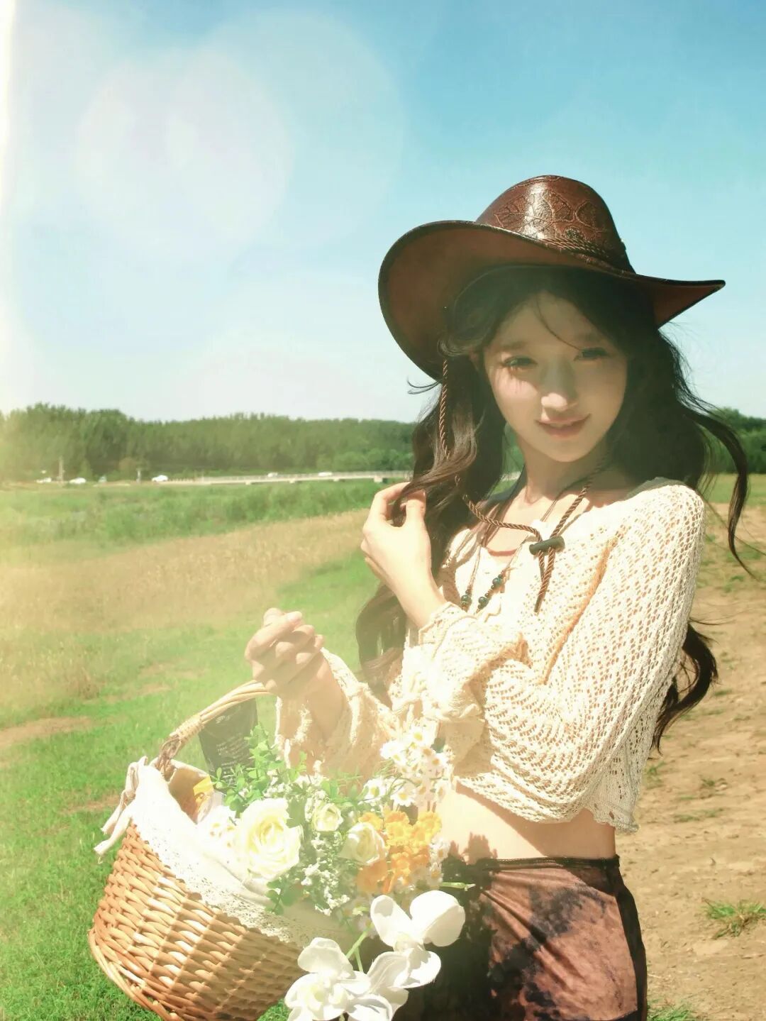 想给牛仔风加入一点浪漫氛围?手持鲜花篮的姿势瞬间“柔化”风格~选一只藤编花篮,装满小雏菊、玫瑰这类清新花材,一只手轻握篮柄,另一只手自然搭在花篮或头发上,身体微微侧身,眼神温柔地看向下方或镜头。若能借助逆光/侧逆光拍摄,阳光穿过花束与发丝,田园牛仔的浪漫感直接拉满~