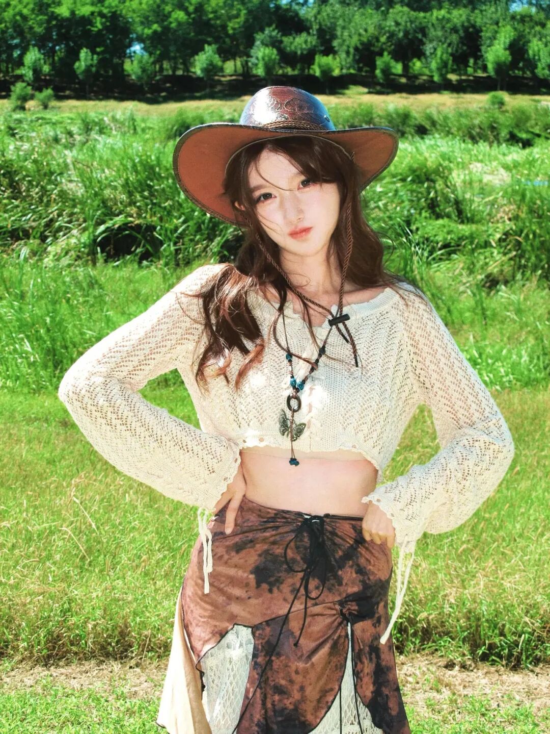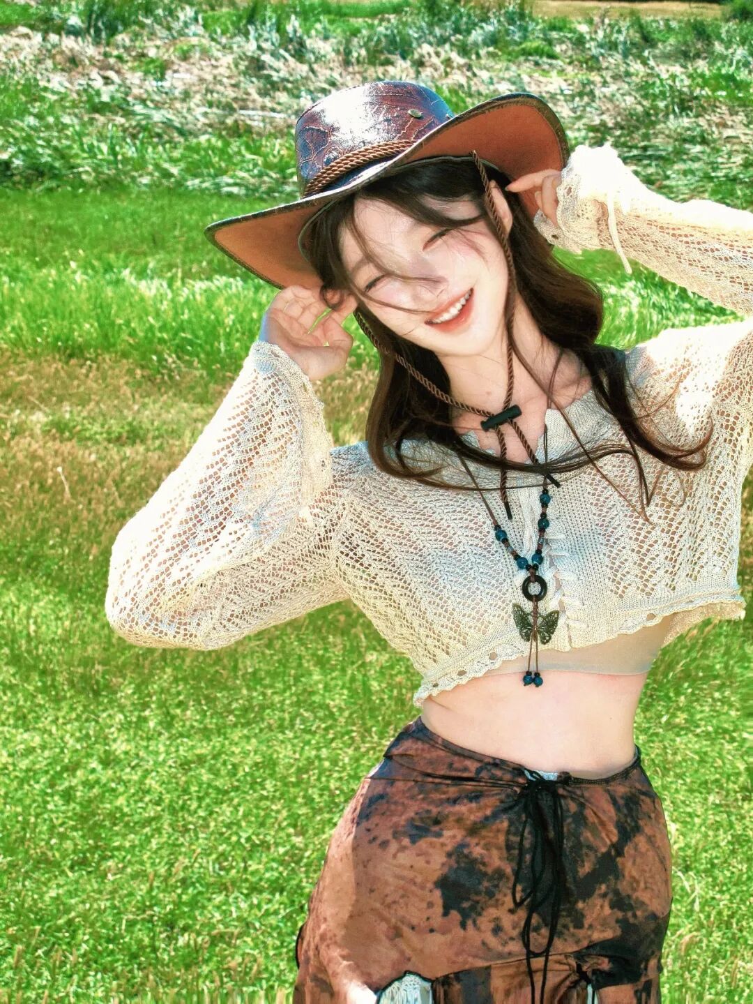 阳光正好时,怎么拍更有氛围感?轻扶帽绳+笑眼弯弯的组合绝了!用一只手轻轻扶住牛仔帽的绳子,另一只手顺带拨一下头发,让发丝自然飘动;脸部朝向阳光(注意用眼神“柔化”光线,避免过度眯眼),嘴角扬起笑意,让阳光柔和地洒在脸上,瞬间捕捉“又甜又野”的牛仔少女感。