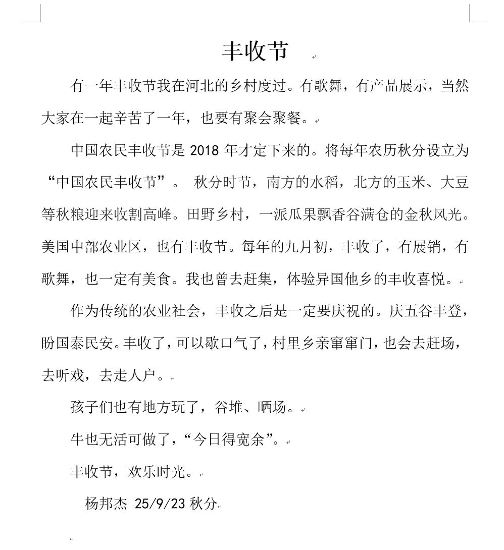 中国农民丰收节是2018年才定下来的。将每年农历秋分设立为“中国农民丰收节”。 秋分时节,南方的水稻,北方的玉米、大豆等秋粮迎来收割高峰。田野乡村,一派瓜果飘香谷满仓的金秋风光。美国中部农业区,也有丰收节。每年的九月初,丰收了,有展销,有歌舞,也一定有美食。我也曾去赶集,体验异国他乡的丰收喜悦。