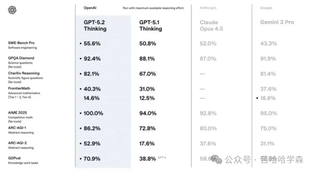 先说最硬的部分,看数据。在一堆核心基准测试里,GPT-5.2 Thinking 几乎全线第一。
