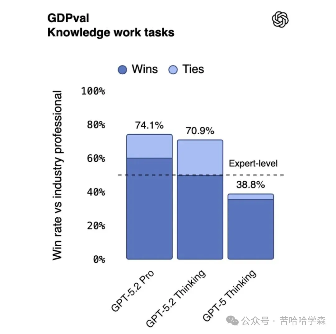 结果是,GPT-5.2 Thinking 赢了 70.9% 的人类专家。注意,是行业里真正干这活的人。上一代 GPT-5 Thinking 只有 38.8%,连一半都不到。这一次,OpenAI 第一次明确站到了“人类专家水平”这条线上。