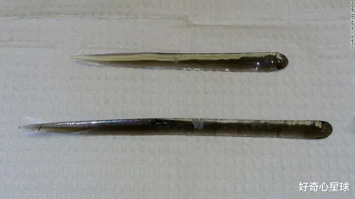 黄貂鱼的尾巴,就像一把匕首一样插入已故患者的体内。