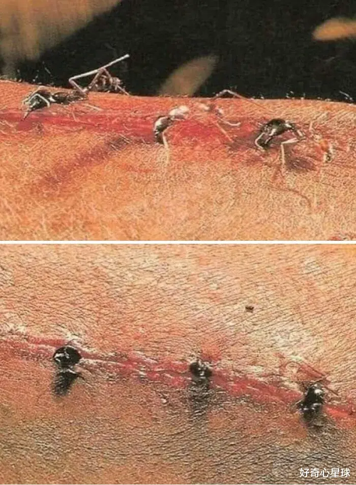 许多土著人使用蚂蚁头作为缝合线。这些蚂蚁就像订书机一样,一旦它们咬住伤口,其身体就会被切断,留下头部充当缝线。