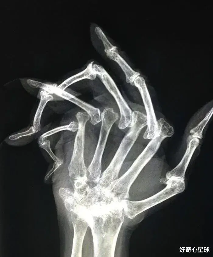 患有晚期类风湿性关节炎的手部 X 光检查。
