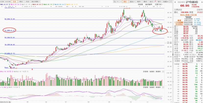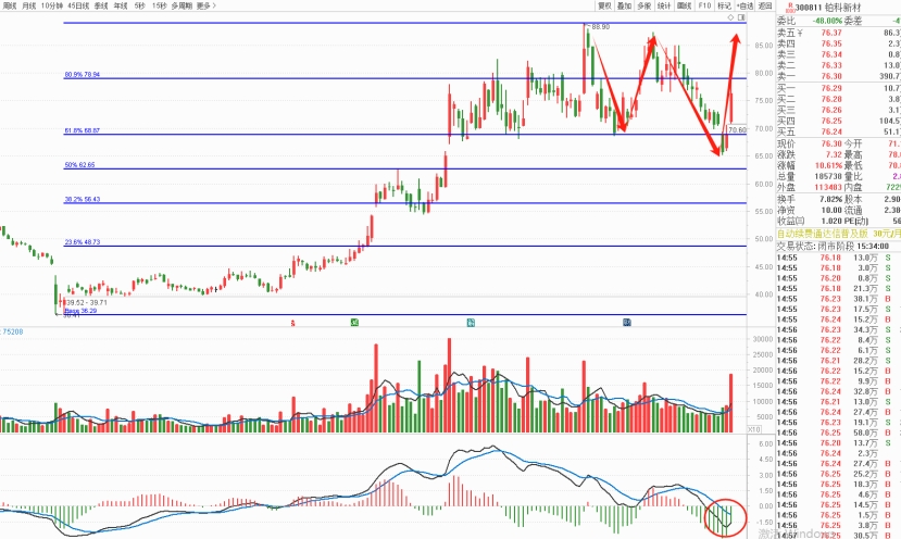 技术分析:股价较高点回撤22%,在36.41/88.90此轮涨幅黄金分割位的61.8与38.2%之间获得支撑并企稳反弹,从运行轨迹上看,有进一步测试前高的动能。
