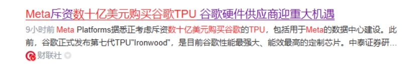 市场消息称,Meta据悉正考虑斥资数十亿美元购买谷歌的TPU,从2027年开始将谷歌的TPU整合到其数据中心内,同时还计划最早在明年从谷歌云租赁TPU算力。