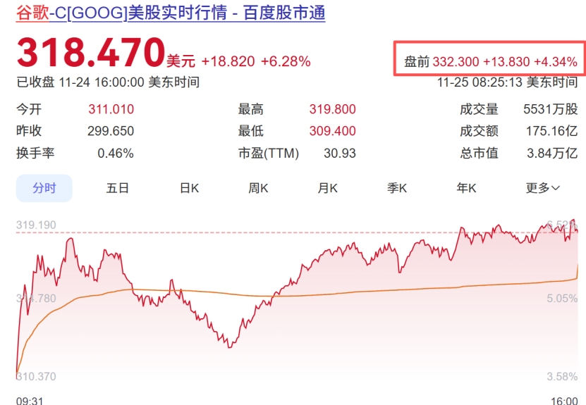 受此影响,谷歌盘前股价大涨超4%,隔夜暴涨超6%,两天时间暴涨超10%,市值增长3840亿美元(2.7万亿人民币),英伟达与AMD股价则应声下跌,跌幅超4%。