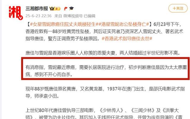 港媒报道称唐佳的妻子患癌住院了,香港警方初步认定唐佳是自杀,是因妻子重病感到悲伤,从而选择自杀。