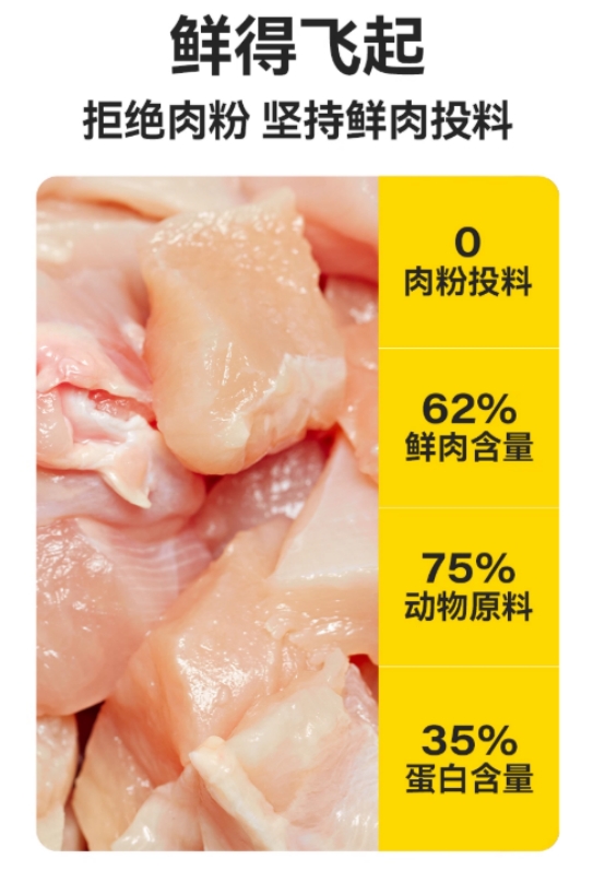 这款是全价烘焙狗粮,肉类原料只有鲜鸡肉和鲜鸡肝,62%超高鲜肉含量,单一肉源更易消化,哪个狗狗看了不心动?营养配比很科学,是高蛋白中脂肪的配比,35%粗蛋白和15%粗脂肪,既能助力狗狗肌肉发育,又能预防虚胖控制体型。搭配南瓜、胡萝卜、苹果等丰富果蔬,长肉不长膘,健康又结实。