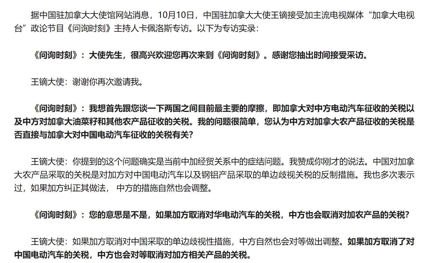 面对加拿大主动改善对华关系的尝试,中国也给了加方一个台阶下,同意息事宁人,王镝大使直言,只要加方肯取消对华电车关税,中方将对等取消对加相关关税。当初中国对加拿大油菜籽加税,很大程度上也是为了反制,因此这也算是给了一个结束中加关税战的机会。