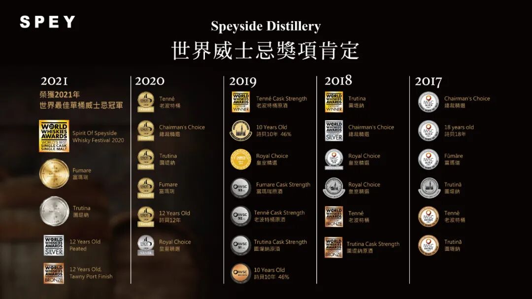 SPEY威士忌屡获国际殊荣,不仅在2021年WWA大赛中斩获“世界最佳单桶”冠军,更早在2020年ISC竞赛创下“五金一银”的佳绩,并连续三年称霸WWA赛事,品质享誉全球。