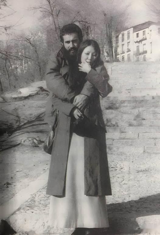 这张照片中的人物是三毛和她的丈夫荷西·马利安·葛罗。两人在户外的石阶旁相拥,整体氛围温馨。三毛留着标志性的长发,穿着长款外套和长裙;荷西留着胡须,穿着厚实的外套。