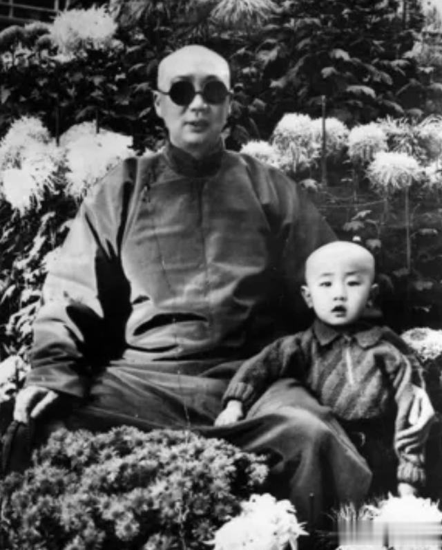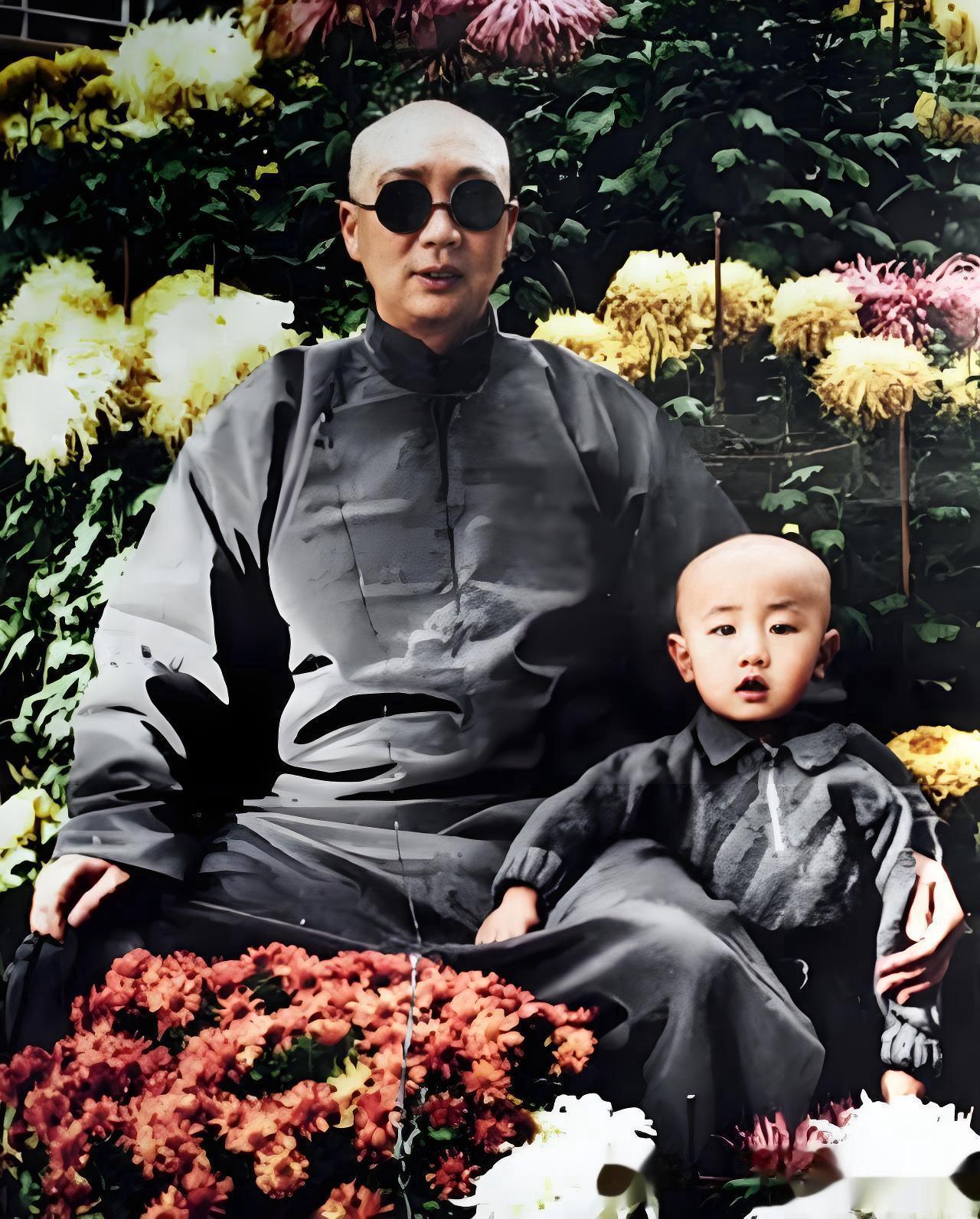 这张照片中的人物是晚清大太监小德张(张兰德)和他的孙儿禄儿。照片中小德张戴着圆形墨镜,身旁的禄儿穿着朴素的童装,两人在一片花丛前合影。