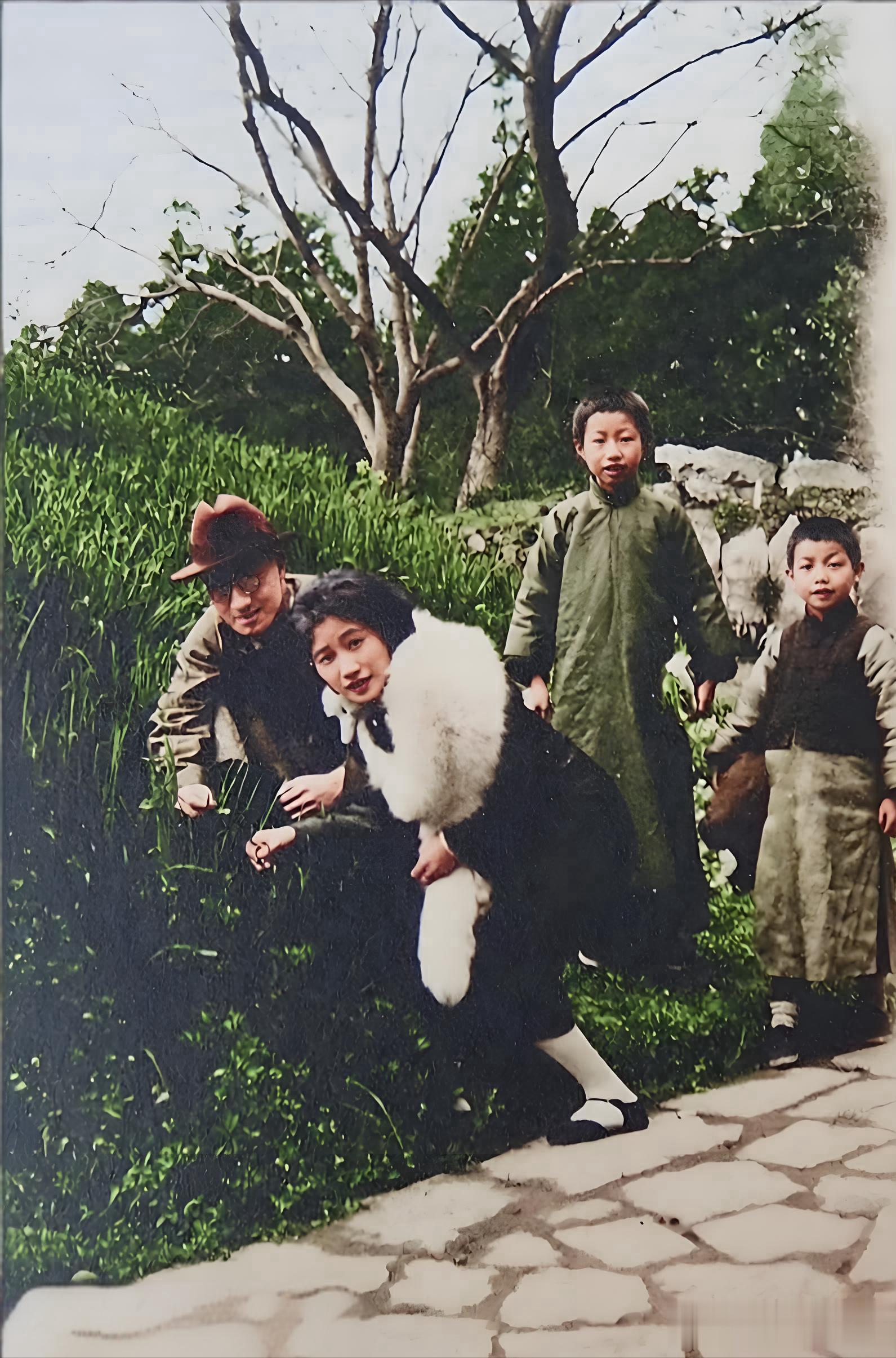 这张照片的主角是陆小曼与翁瑞午,画面中后方的两名孩童是陆宗麒、陆宗枬。照片里,陆小曼姿态娇俏;身旁的翁瑞午头戴礼帽,俯身与她同赏草木。