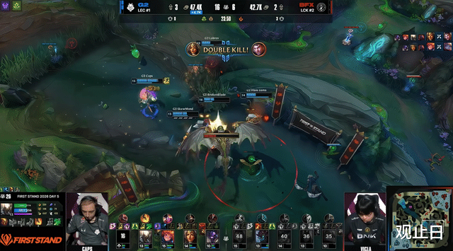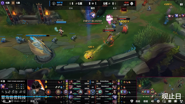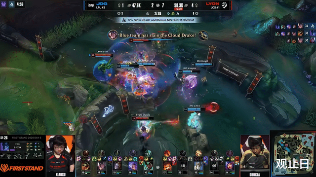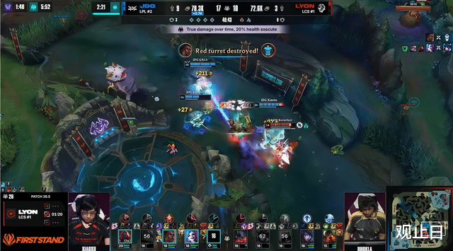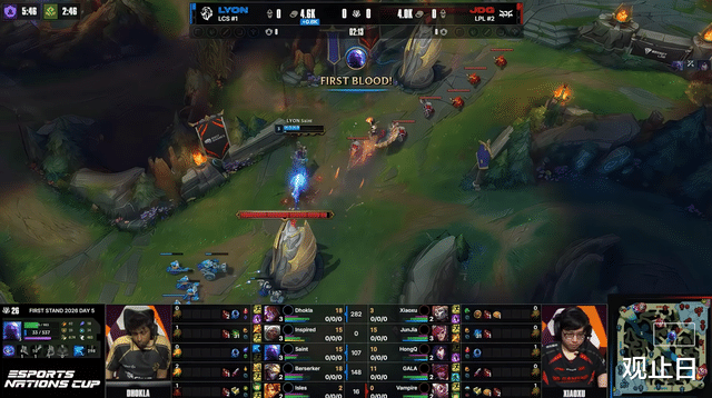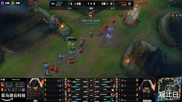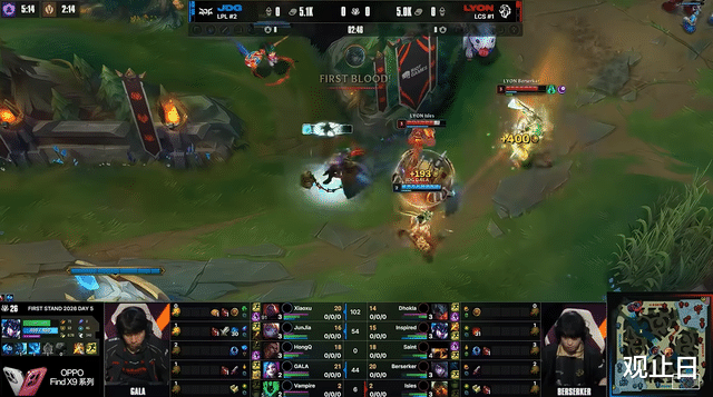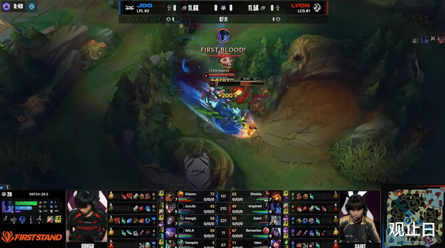 2分钟LYON下路线杀拿一血,JDG前期陷入被动。