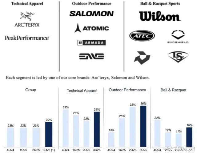 11月18日,亚玛芬体育发布2025年第三季度财报,集团营收同比增长30%至17.56亿美元,其中大中华区增长47%至32.87亿人民币。集团里以始祖鸟为主导的「功能性服装Technical Apparel」板块,营收同比增长31%;萨洛蒙所在的「户外装备Outdoor Performance」板块则增长最快,收入上也超过了始祖鸟——亚玛芬集团的增长引擎,已经在换挡了。